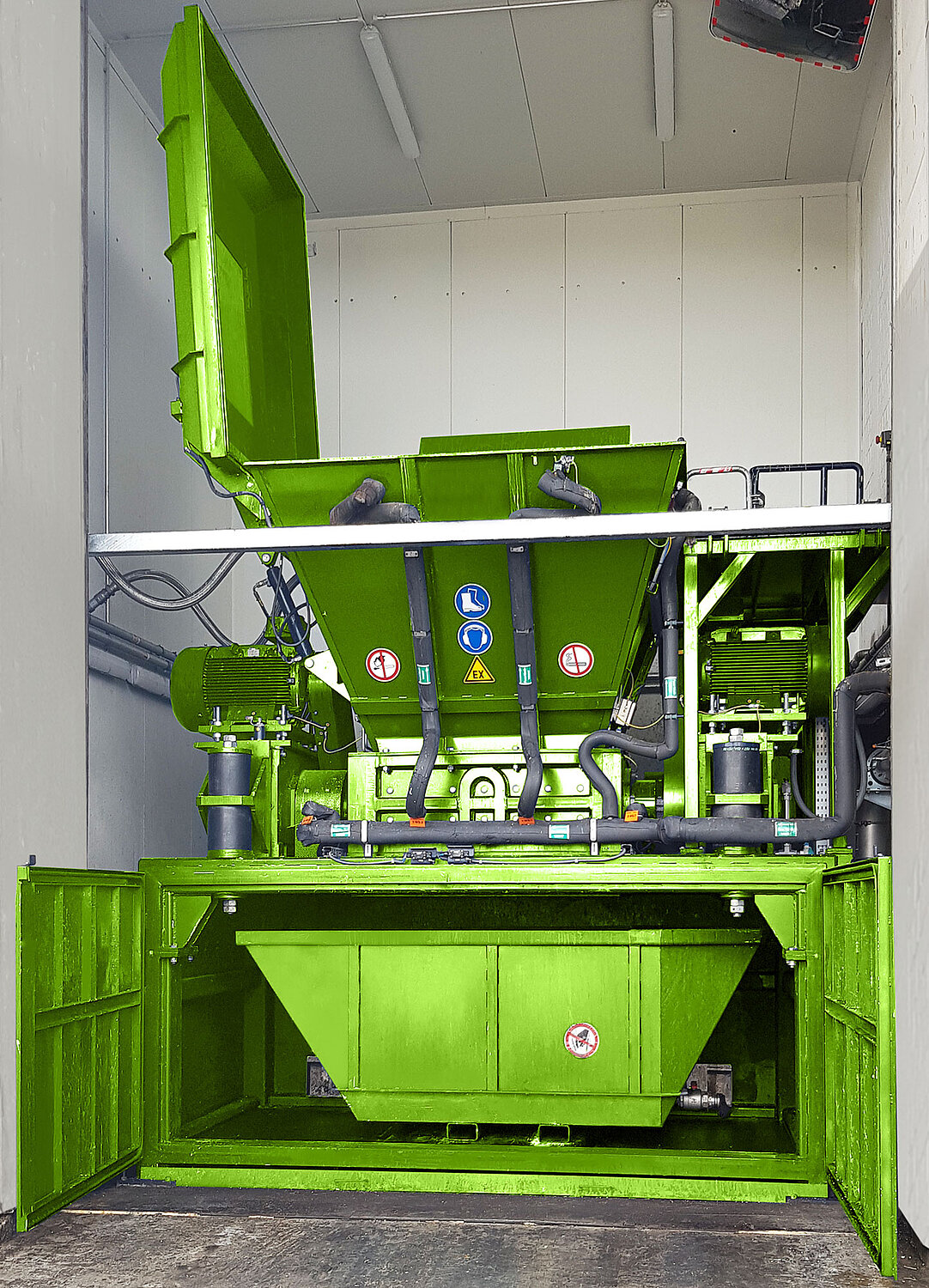 The supplementary trough-type discharge station ensures easy separation of solid matter from the released fluids upon completion of the shredding process.