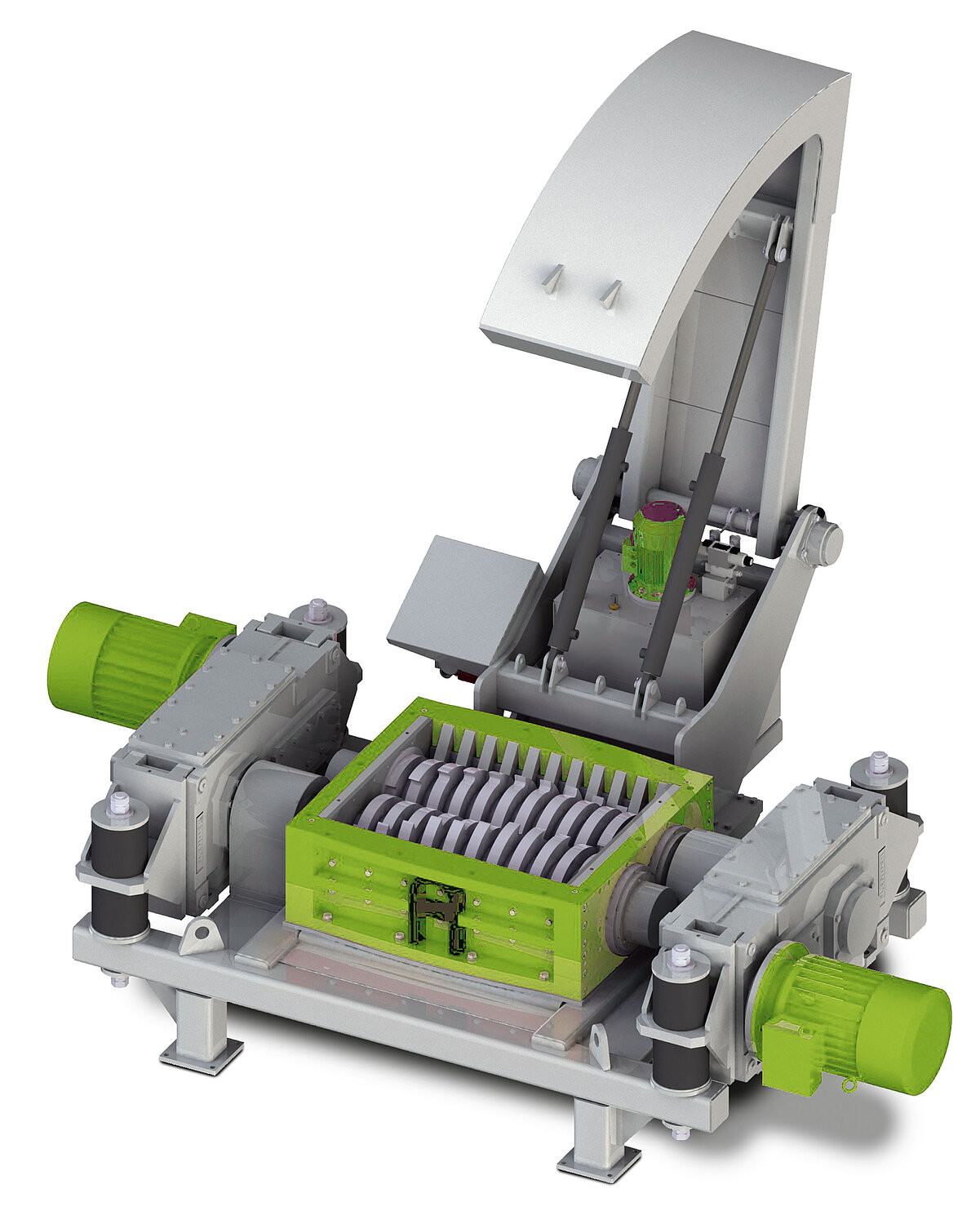 Optionally a hydraulic mechanism to push heavier materials, such as furniture or large tyres, into the cutting unit. The shredder can still be retrofitted later. Depending on the usage scenario there are a number of different machine sizes, motors and cutting blade widths available. Our specialists are happy to advise you to select the correct machine model.